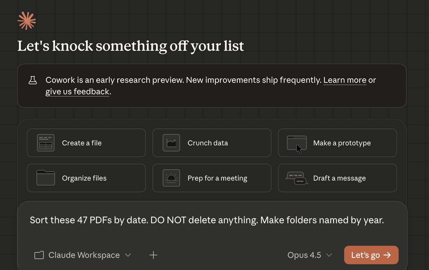 ✅ Good: "Sort these 47 PDFs by date. DO NOT delete anything. Make folders named by year."