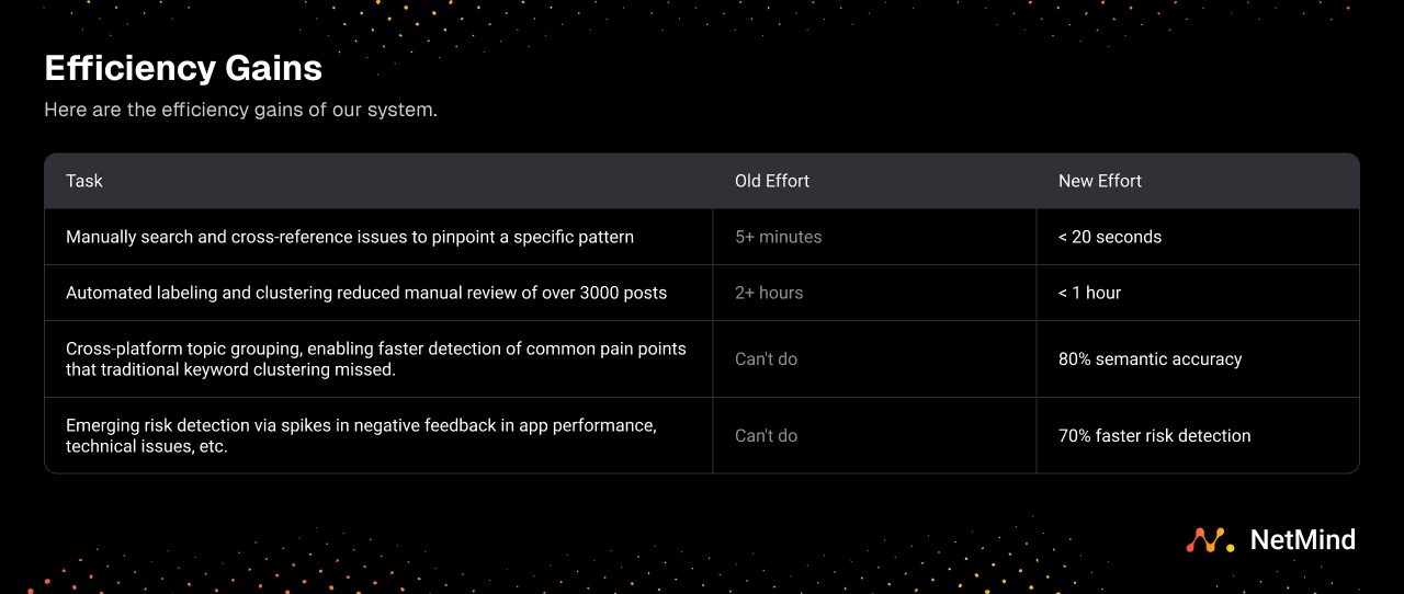 | Automated labeling and clustering reduced manual review of over 3000 posts | 2+ hours | < 1 hour |
