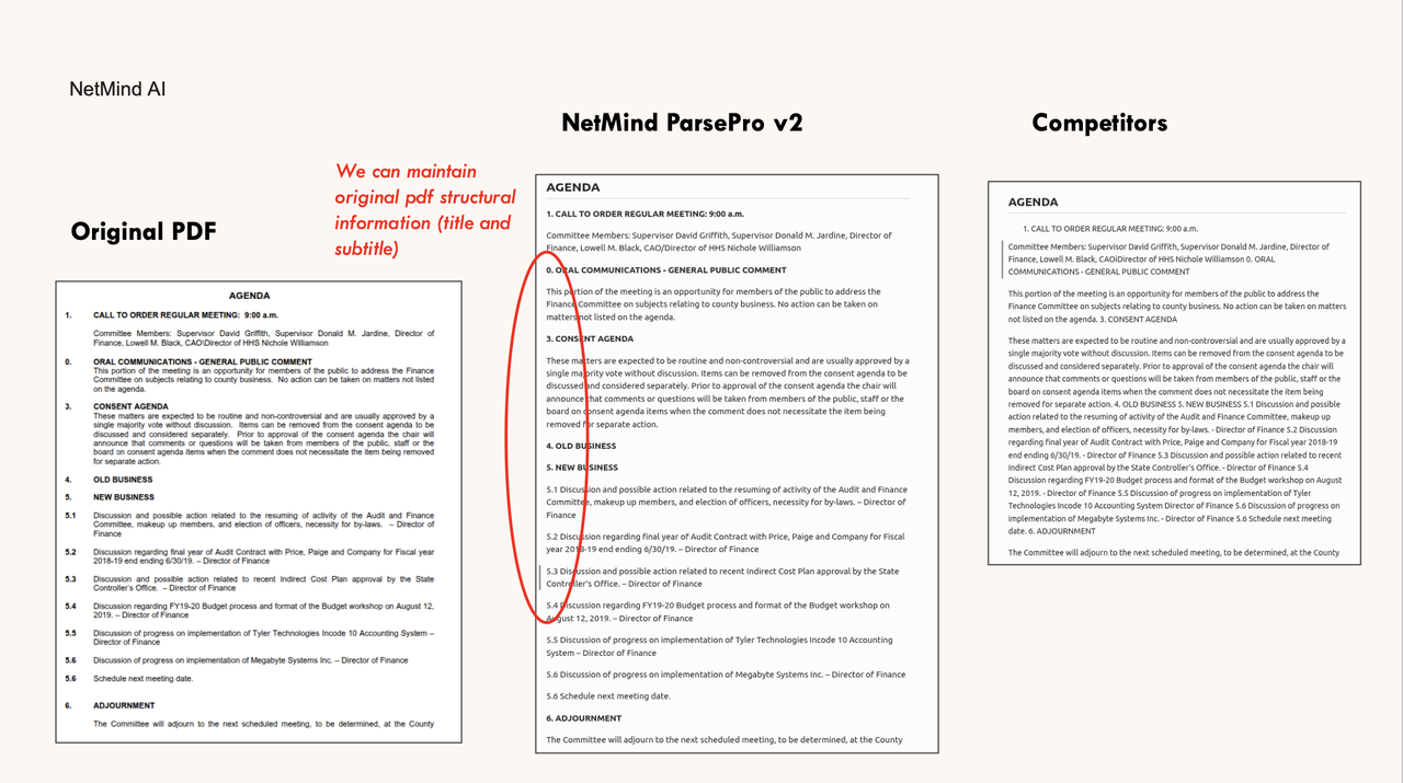When NetMind Parse Pro detects visual content, it automatically routes the data to an OCR (Optical Character Recognition) system for interpretation. OCR enables machines to “read” text embedded in scanned documents or images, and our OCR system goes beyond simply identifying printed characters. It understands contextual relationships within tables and charts, providing a reliable foundation for downstream AI reasoning.
