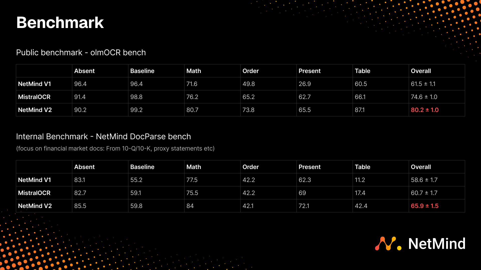 In public and internal benchmarks, NetMind V2 outperformed strong baselines such as MistralOCR, achieving an overall score of 80.2 ± 1.0 on the olmOCR benchmark and 65.9 ± 1.5 on our internal DocParse benchmark, which focuses on financial documents.