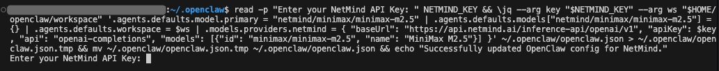 read -p "Enter your NetMind API Key: " NETMIND_KEY && \jq --arg key "$NETMIND_KEY" --arg ws "$HOME/openclaw/workspace" '.agents.defaults.model.primary = "netmind/minimax/minimax-m2.5" | .agents.defaults.models["netmind/minimax/minimax-m2.5"] = {} | .agents.defaults.workspace = $ws | .models.providers.netmind = { "baseUrl": "https://api.netmind.ai/inference-api/openai/v1", "apiKey": $key, "api": "openai-completions", "models": [{"id": "minimax/minimax-m2.5", "name": "MiniMax M2.5"}] }' ~/.openclaw/openclaw.json > ~/.openclaw/openclaw.json.tmp && mv ~/.openclaw/openclaw.json.tmp ~/.openclaw/openclaw.json && echo "Successfully updated OpenClaw config for NetMind."