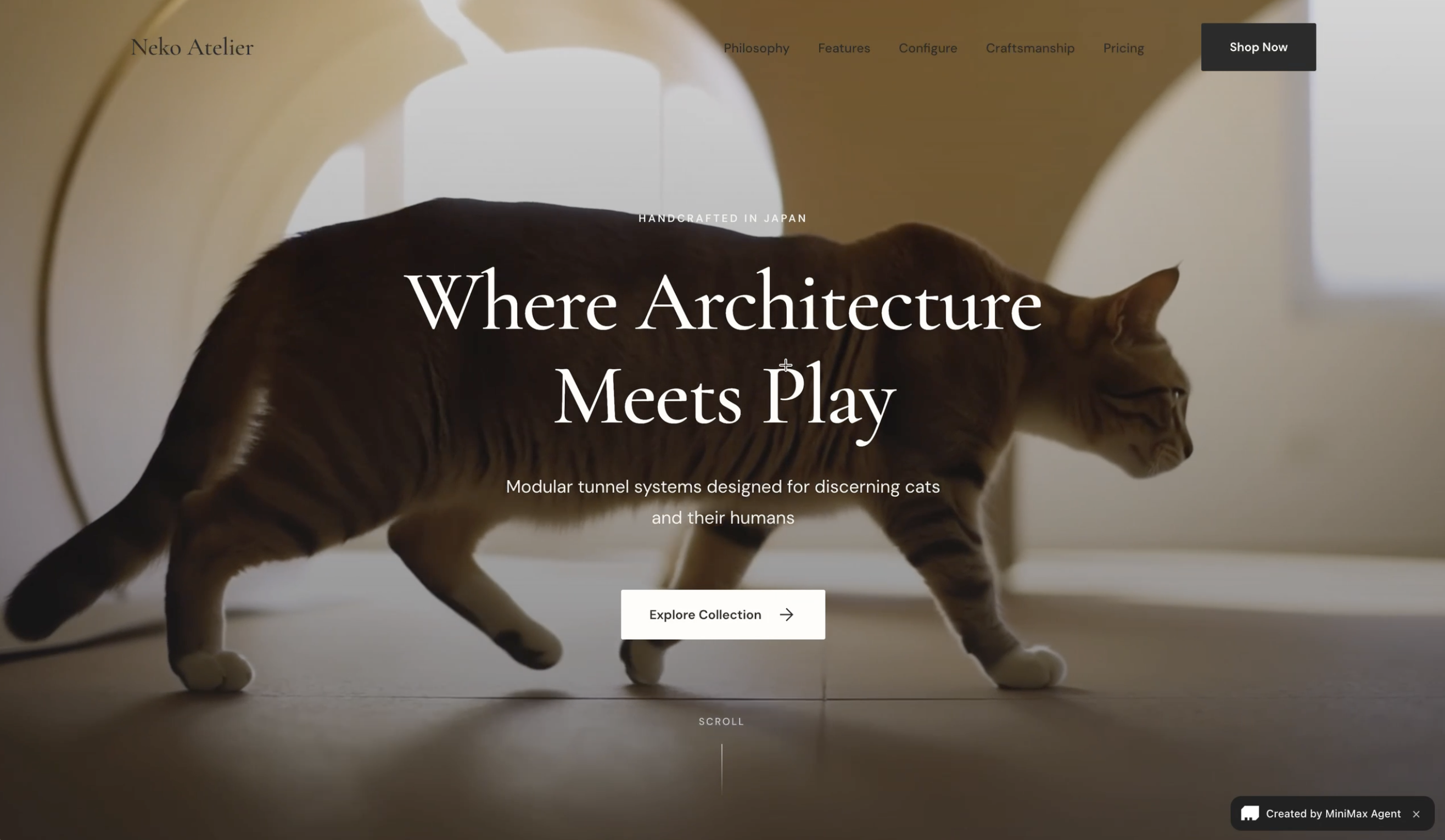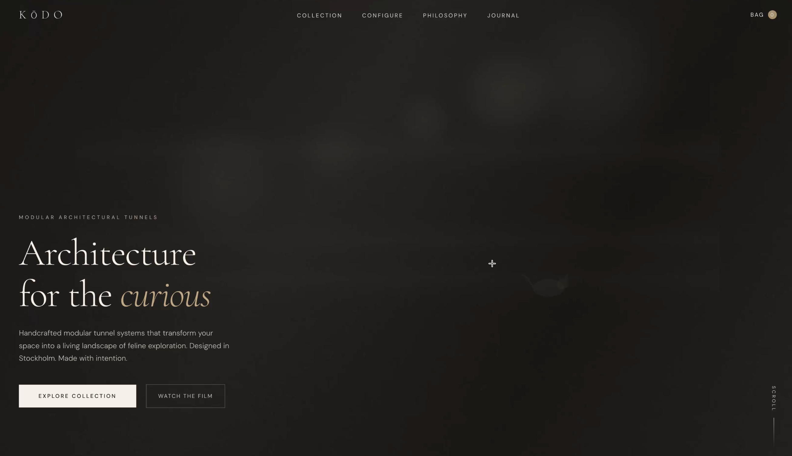 E-commerce website for a premium, modular, architectural cat tunnel system. The hero section features a high-definition, cinematic auto-play video of a cat gracefully darting through and playing within a modular tunnel system, capturing fluid movement and texture. Grid-based, spacious, and clean layout utilizing asymmetrical blocks and large-format architectural product photography. Subtle parallax scrolling transitions and an interactive 3D configurator widget demonstrated mid-screen. The style is Scandinavian minimalist meets Wabi-Sabi; refined, peaceful, and quietly luxurious. Muted, earthy tones: warm ivory, soft gray, heather beige, and deep charcoal. High-fidelity photorealism, Figma aesthetics, Architectural Digest quality product visualization.